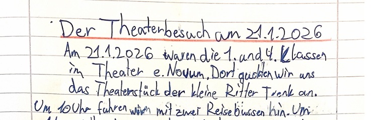 Dieses Jahr besuchten die 2. und 3. Klassen am 15.01.26 sowie die 1. und 4. Klassen das Theater im enovum und sahen sich das Stück „Der kleine Ritter Trenk“ an. Eine Schülerin der Klasse 4c schrieb darüber einen tollen Bericht: Unsere Theaterfahrt