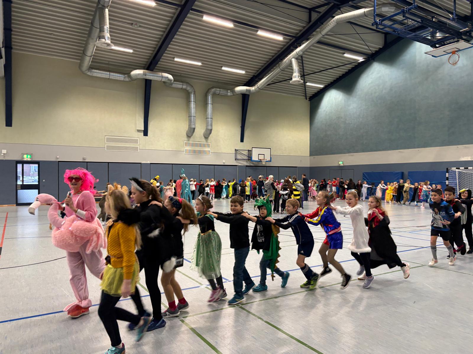 Der Tag begann mit einer gemeinsamen Auftaktveranstaltung in der Turnhalle, bei der sich die gesamte Schulgemeinschaft versammelte. Die Klasse 4b führte mit viel Engagement und guter Laune durch das Programm. Mit ihren einstudierten Mitmachtänzen sorgten die Schülerinnen und Schüler für großartige Stimmung und luden alle Kinder zum Mitmachen ein. Dabei konnten auch die vielfältigen und kreativen Kostüme präsentiert werden – von fantasievoll über lustig bis hin zu ganz individuell gestaltet war alles vertreten.