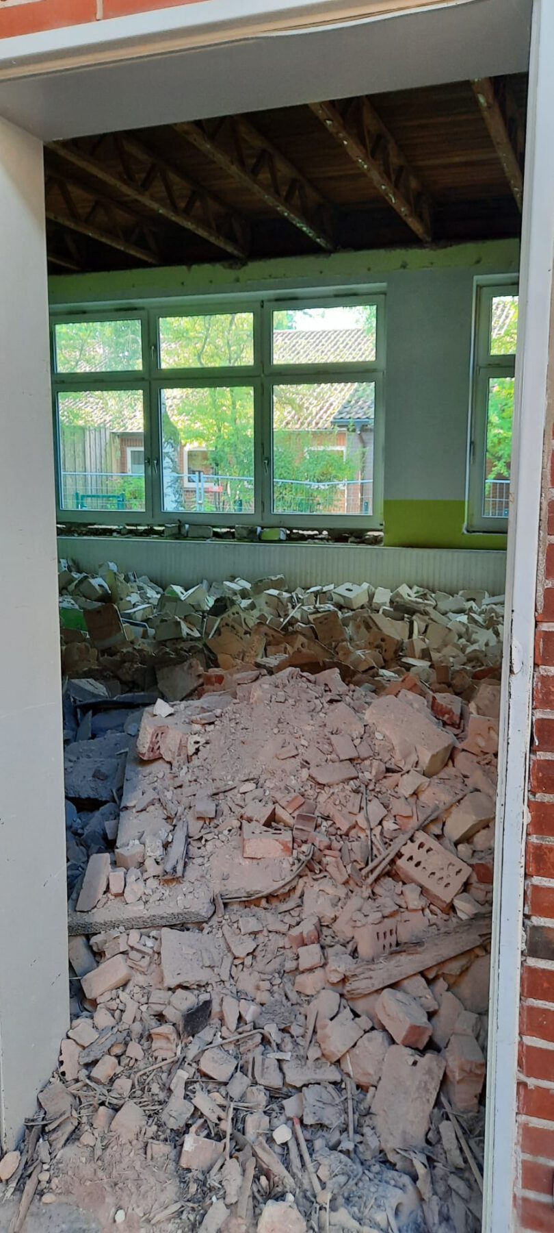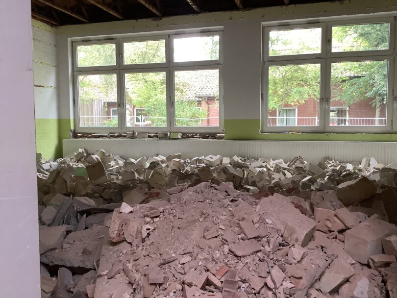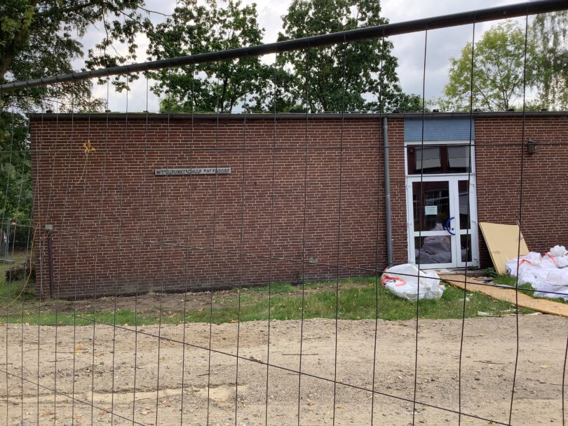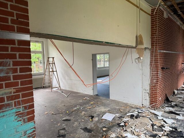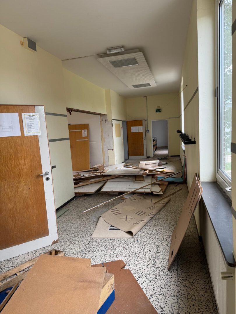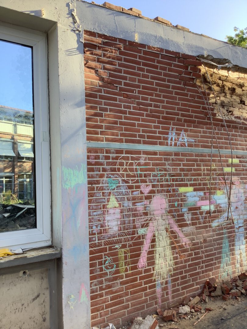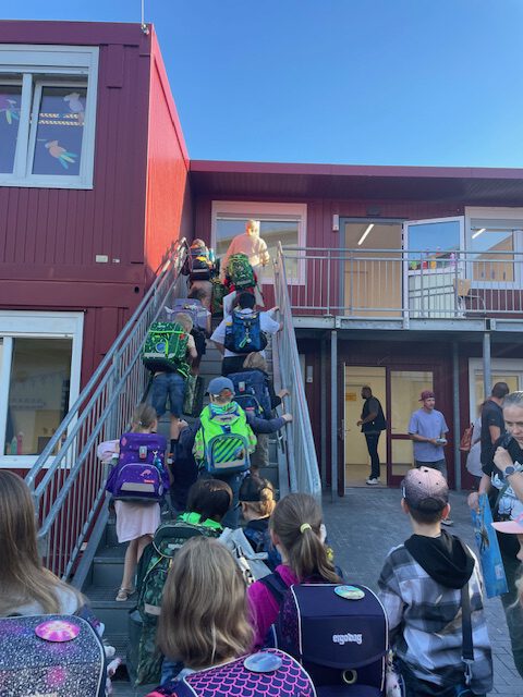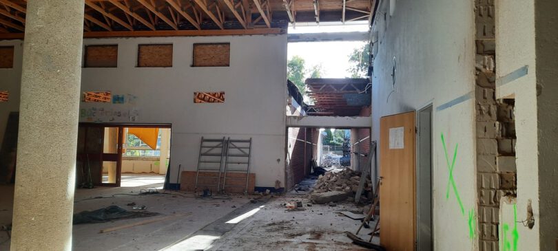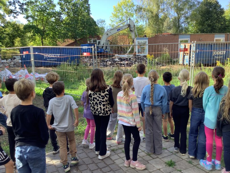 In den nächsten zwei bis drei Jahren wird unsere Schule in Teilen abgerissen und neu gebaut und in Teilen saniert. Während des Umbaus kann dort kein Unterricht stattfinden und so bekommen 8 Klassen eine neue „rote Schule“ neben der Turnhalle. Mit einer „Abrissparty“ vor den Sommerferien haben wir uns von der „alten“ Schule farbenfroh verabschiedet. Alle Materialien wurden in Kartons verpackt und für den Umzug in die „rote Schule“ vorbereitet. Mit Beginn des neuen Schuljahres konnten wir in die neuen Klassenräume einziehen. Gleichzeitig passiert auch ganz viel auf der Baustelle. Wir werden vom Neu- und Umbau der Schule immer wieder Fotos machen, die hier zu sehen sind.